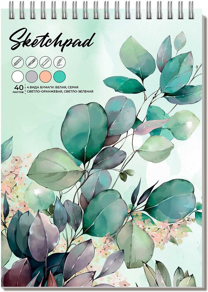 Скетчпад — это настоящая находка для творческих людей. Он может служить одновременно и учебником для рисования, и тетрадью для записей и рисунков, ведь на его страницах есть и упражнения для начинающих рисовальщиков, и пространство для собственных креативных идей. В скетчпаде 4 цвета офсетной бумаги: белый, зелёный, оранжевый, серый.