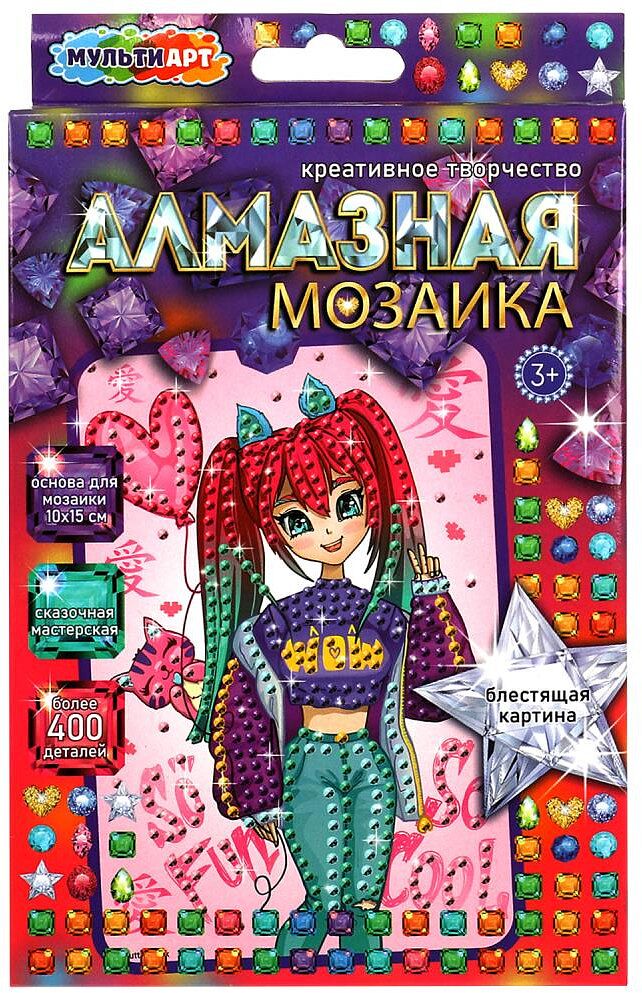 Набор для детского творчества — алмазная мозаика «Аниме девочка» — отличный подарок для ребёнка, который будет способствовать развитию его творческих способностей. При помощи этого набора маленький художник сможет создать красивую картинку-мозаику, декорированную сверкающими стразами. Яркую блестящую поделку можно подарить близким или использовать для украшения комнаты. Творческие занятия с алмазной мозаикой ТМ «Мульти Арт» обладают успокаивающим действием, а также развивают: творческое мышление, цветовое восприятие, усидчивость, внимание, аккуратность. В комплект входит: • основа для мозаики 10 × 15 см — 1 шт.. • подставка — 1 шт.. • стразы — 1 комплект. • емкость для страз — 1 шт.. • инструмент — 1 шт.