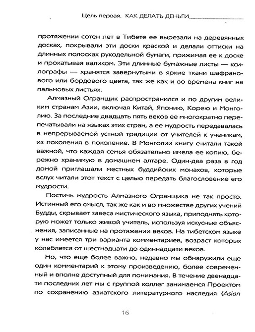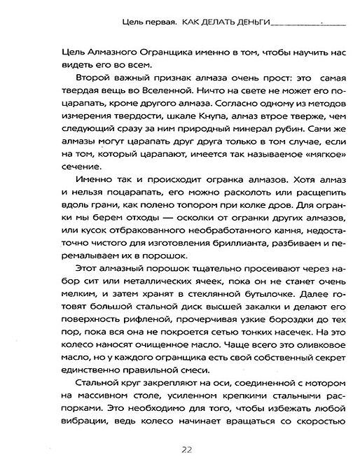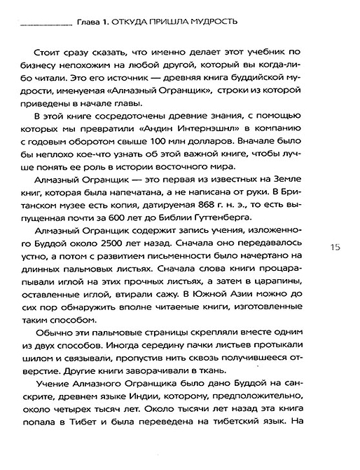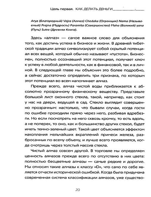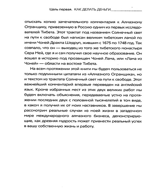 В этой книге автор подробно описывает, как ему удалось достичь успехов в среде жесткой конкуренции, и как, используя принципы, описанные в древней сутре Алмазного Огранщика, любой человек может повторить его успех. Ведь и древняя тибетская мудрость, и современные правила ведения бизнеса, и все человеческие устремления имеют одну общую цель - обогатить нашу жизнь.