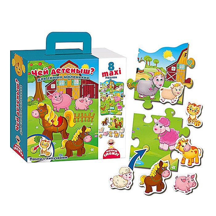 А знает ли Ваш малыш, как выглядят детеныши разных животных? Каждый ребенок стремится быть рядом со своей мамой, но на ферме произошел беспорядок, и некоторые зверьки потерялись. Пусть малыш поможет им. Для этого сначала нужно сложить пазл, а затем поискать на нем родителей для каждого маленького животного. Поросенок возле свинки, теленок возле коровки, вот и нашлись! Фигурки очень легко крепятся к пазлу благодаря удобным липучкам и хорошо тренируют мелкую моторику у ребенка. Комплектация: 8 пазловых деталей, 8 картонных фигурок, 8 желтых и 8 белых липучек