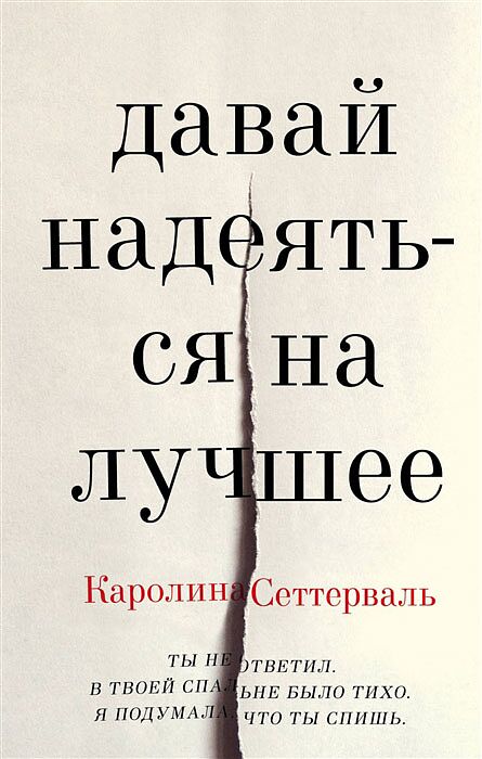 Во время кормления своего грудного сына Каролина получает странное письмо от любимого мужа Акселя — в нём он сообщает пароли от своего компьютера и дает распоряжения на случай его смерти. Каролина сначала удивляется, затем раздражается — это так типично для ее несентиментального мужчины. Свое письмо Аксель заканчивает фразой Давай надеяться на лучшее! Вскоре он умирает во сне. Блистательный литературный дебют — автобиографический роман Каролины Сеттерваль мгновенно стал бестселлером в Швеции и был переведен на 24 языка. В интимной, пронзительной манере автор рассказывает о сложностях построения отношений в современном мире, — и о цене, которую приходится за это уплатить. Как справиться с утратой любимого и не утонуть в депрессии и всепоглощающем чувстве вины? Как и зачем строить новые отношения в мире, навсегда разделенном на до и после? Страшные вопросы, ответы на которые можно получить, только прожив эти события по-настоящему…