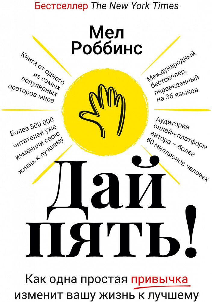 Поддерживать друзей, родных, коллег — естественное проявление чувств для каждого из нас. А то, что поддерживать надо и самих себя, мы постоянно забываем. Более того, если хвалить других для нас норма, то себя мы обычно ругаем, критикуем, ищем изъяны. А что, если начать хвалить себя? Что, если каждый день давать себе пять? Известная писательница и оратор Мел Роббинс призывает освоить одну простую, но очень действенную привычку, которая способна в корне изменить вашу жизнь: давать себе пять каждое утро. Делая так, вы научитесь отлавливать у себя в голове мысли и убеждения, которые создают препятствия на вашем жизненном пути, такие как чувство вины, ревность, страх, тревога или неуверенность. И что еще важнее, вы сможете трансформировать их в новые мысли и модели поведения, которые воодушевляют и помогают двигаться вперед. Вы начнете лучше понимать себя и укрепите самые важные отношения в своей жизни — отношения со своим «я». Эту привычку благодаря автору освоили уже более полумиллиона читателей по всему миру.
