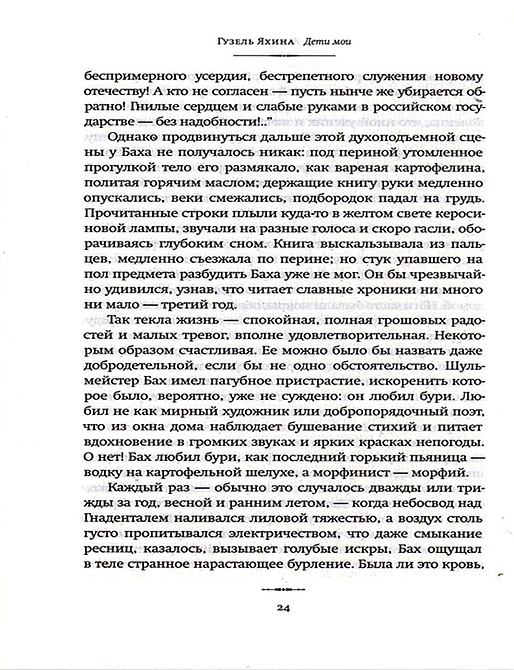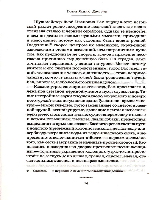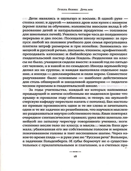 Гузель Яхина - автор Тотального диктанта в 2018 году: три отрывка из нового романа «Дети мои» задействованы в одной из самых масштабных просветительских акций в России.«Дети мои» - новый роман Гузель Яхиной, самой яркой дебютантки в истории российской литературы новейшего времени, лауреата премий «Большая книга» и «Ясная Поляна» за бестселлер «Зулейха открывает глаза».Поволжье, 1920-1930-е годы. Якоб Бах - российский немец, учитель в колонии Гнаденталь. Он давно отвернулся от мира, растит единственную дочь Анче на уединенном хуторе и пишет волшебные сказки, которые чудесным и трагическим образом воплощаются в реальность.«Я хотела рассказать о мире немецкого Поволжья - ярком, самобытном, живом - о мире, когда-то созданном пришлыми людьми в чужой стране, а сегодня затерянном в прошлом. Но это еще и история о том, как большая любовь порождает страхи в нашем сердце и одновременно помогает их превозмочь». Гузель ЯхинаГузель Яхина - писатель, лауреат премий «Ясная Поляна» и «Большая книга». Родилась в Казани, окончила Казанский государственный педагогический институт, сценарный факультет Московской школы кино. Дебютный роман «Зулейха открывает глаза» стал ярким событием в литературе, отмечен ведущими литературными премиями. Издан тиражом более 200 тыс. экз. и переведен на 30 языков. В 2018 года Гузель Яхина стала автором «Тотального диктанта». Три текста для разных часовых поясов, названные «Утро», «День» и «Вечер» - избранные отрывки из романа «Дети мои». Цитата: «Дети не боялись ничего. В их доверчивых взорах и открытых лицах Бах узнавал то же бесстрашие, что наблюдал с рождения в глазах Анче. Голоса детей были полны веры и страсти, а улыбки - любви и надежд. Движения их были свободны, радостны, и они несли эту радость и эту свободу с собой - на покровские улицы, в тесные пространства местных рабочих клубов, театров, читален. Детей не пугали рыбьи и мышиные морды взрослых - возможно, дети их попросту не замечали: они проходили сквозь чужие страхи - как через мелкий брод, оставаясь при этом сухими. Мир распадался надвое: мир испуганных взрослых и мир бесстрашных детей существовали рядом и не пересекались».