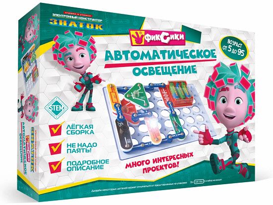 Электронный конструктор начального уровня, позволяющий ребёнку понять, как работают многие «умные вещи» вокруг нас, в частности, системы автоматического освещения, которые экономят электроэнергию и, следовательно, деньги. Даже без помощи взрослых, используя очень понятное цветное руководство, всего за несколько минут, он или она смогут собрать и испытать схему с практически 100% положительным результатом. Очень полезна будет подсказка в виде QR-кода, которую можно просмотреть при помощи смартфона или планшета.