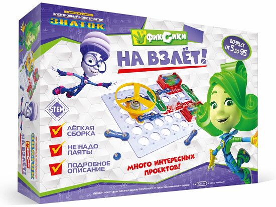 Электронный конструктор начального уровня, позволяющий ребёнку понять, как работают многие умные вещи вокруг нас, и в частности, исследовать схемы с пропеллером, понять принцип тяни-толкай в авиации. И просто позапускать пропеллер! Даже без помощи взрослых, используя очень понятное цветное руководство, всего за несколько минут, дети смогут собрать и испытать схему с практически 100% положительным результатом. Очень полезна будет подсказка в виде QR-кода, которую можно просмотреть при помощи смартфона или планшета В комплекте: Руководство пользователя и детали, необходимые для выполнения предложенных в руководстве проектов. Руководство с описанием схем располагается в коробке под прозрачной монтажной платой. Нижняя часть коробки вместе с деталями и книгой запечатана в полиэтиленовую плёнку. Характеристики: Материал: пластик, металл Питание: 3 батареи (приобретаются отдельно) размера АА, напряжением 1,5 V. Размер упаковки: 28 x 19.5 x 4.5 см Упаковка: коробка Страна бренда: Россия Возраст: от 5 лет