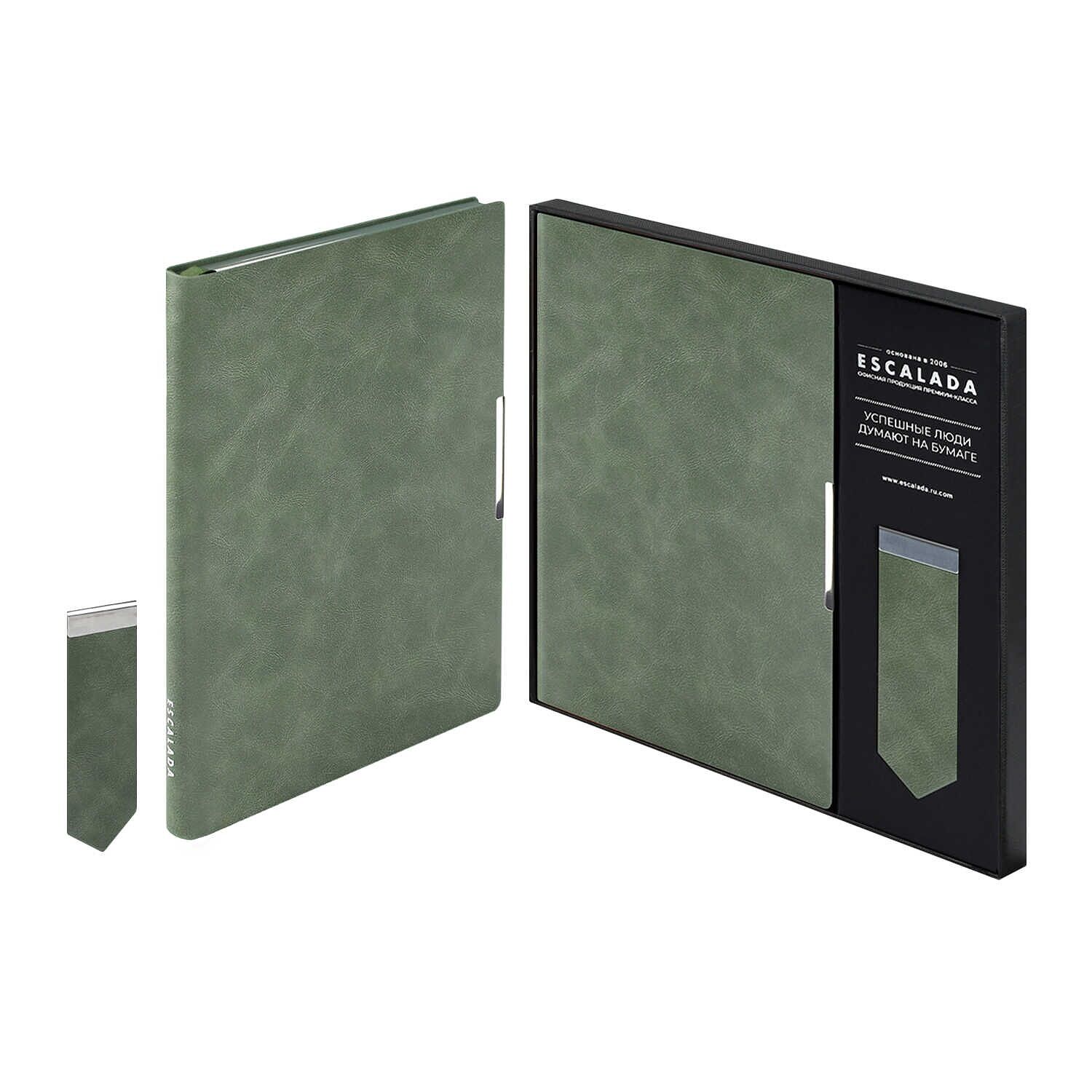 Ежедневник недатированный + закладка д/книг (набор подарочный) ESCALADA, А5, 120 л., арт. 70565/ 10 БАКСТЕР ОЛИВКОВЫЙ (кожзам: 146х211. 35х100 мм, мягкий переплёт, запаянный край, материал обложки: искусственная кожа Бакстер. способ крепления блока: ниткошвейный. декор: металлический шильд по краю обложки. вн. блок: 120 л., кремовый офсет 70 г/м², печать в одну краску (линия), справочный материал: есть. перфорация углов блока: нет. отделка среза: окрашивание пантоном. закладка/-и: два ляссе, каптал: есть. форзац: печать пантоном, персонализация возможна: да. индивидуальная упаковка: подарочная картонная коробка с ПВХ-крышкой + ПЭТ-пакет)