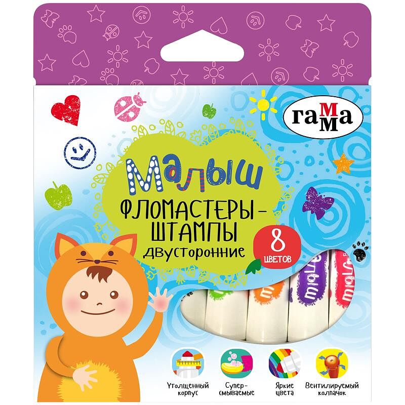 Первые фломастеры для малышей. Не требуют никаких специальных навыков – подходят для рисования даже самыми маленькими детьми. Утолщенная форма корпуса (диаметр 14 мм, длина 135 мм) удобна для маленьких детей и позволяет легко держать фломастер в руке, а с помощью утолщенного пишущего узла диаметром 3 мм малыш получит крупные яркие штрихи. Фломастеры выдерживают сильный нажим, наконечник не вдавливается внутрь. Не высыхают без колпачка в течение 96 часов. Длина письма 450 м. Полностью безопасные гипоаллергенные чернила на водной основе с пищевыми красителями. Специальный вентилируемый колпачок обеспечивает прохождение воздуха при случайном проглатывании. Легко смываются с кожи и отстирываются с большинства видов тканей. Расширенная палитра в 12 цветов (желтый, красный, зеленый, голубой, синий, фиолетовый, оранжевый, розовый, серый, темно-зеленый, коричневый, черный) поможет продолжить знакомство ребенка с многообразием цветов и развитие навыков рисования.
