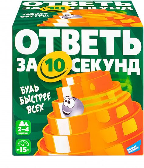 Настольная игра позволит весело и интересно провести совместный досуг с друзьями и в кругу семьи. Назови 5 супергероев, или 5 животных с рогами, а может 3 героя из одного и того же фильма! Будь быстрее всех, ведь на ответ у тебя есть всего 10 секунд! Это весёлая игра, где нужно быстро отвечать на неожиданные вопросы. Внутри вы найдёте необычный таймер с шариком. Он отсчитывает 10 секунд и за это время игрок должен быстро сообразить и ответить на вопрос. В игре невероятно простые правила, но многие вопросы могут поставить вас в тупик. Как только шарик достиг финиша — время для ответа истекает, поэтому думайте быстрее всех! Комплектация: • Игровые карточки 120 шт. • Правила игры 1 шт.. • Таймер 1 шт.. • Шарики 5 шт.