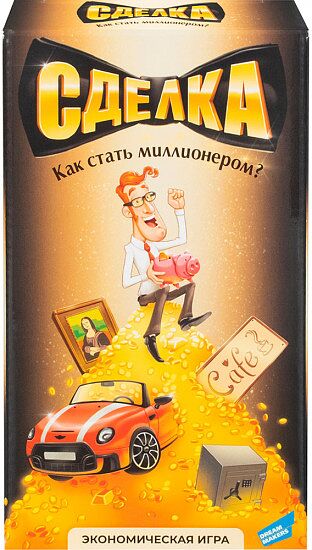 Хочешь открыть свой ресторан? Мечтаешь о собственном острове? Все это возможно в увлекательной экономической игре «Сделка»! Покупай острова, машины и предметы искусства, подставляй соперников или просто откладывай деньги в банк. Твоя цель — стать самым богатым. Успей заключить свою самую выгодную сделку! Правила игры понятны даже ребенку, поэтому развивающая карточная экономическая игра будет занимательной и увлекающей, полезной для логического мышления, развитие финансовой грамотности и просто дарящей веселье. Эта игра отлично подходит в качестве подарка ребенку от 12 лет, подростку и взрослому. Компактный размер упаковки позволяет брать игру с собой куда-угодно: в дорогу, в путешествие, на дачу, в гости, на посиделки с друзьями, в школу, на пикник. Играть в экономическую игру «Сделка» можно как шумной компанией друзей во время вечеринки, заручившись поддержкой болельщиков, так и в семейном кругу вечером. Игра предназначена для 2-5 игроков. Тонкости интеллектуальной игры, смекалка, умение противостоять банкротству и крупное бизнес-везение — все это испытания, которые предстоит пройти каждому в этой экономической настольной игре. Суть игры проста: игрок может приобретать недвижимость, острова, рестораны и даже дорогостоящих домашних питомцев. В процессе игры, каждый может совершать различные действия, которые могут быть как в ползу самому себе, так и направлены против других игроков. По итогу игры побеждает тот, кто собрал самое большое состояние. Комплектация: игровые карточки — 100 шт., правила игры.