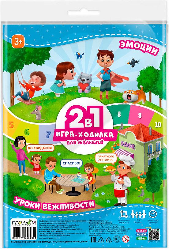 Игры-ходилки для малышей имеют две стороны. Это значит, что в одном пакете сразу две интересные тематики игр. Игра-ходилка с фишками для малышей 2 в 1. «Эмоции. Уроки вежливости» — с одной стороны знакомит малышей с различными эмоциями, которые ребёнок испытывает каждый день в своей жизни. А обратная сторона «Уроки вежливости» демонстрирует ребёнку примеры ситуаций, в которых он может использовать то или иное вежливое слово. Теперь тематики игр можно менять так часто, как захочется, при этом на каждом игровом поле — две стороны и два разных приключения!