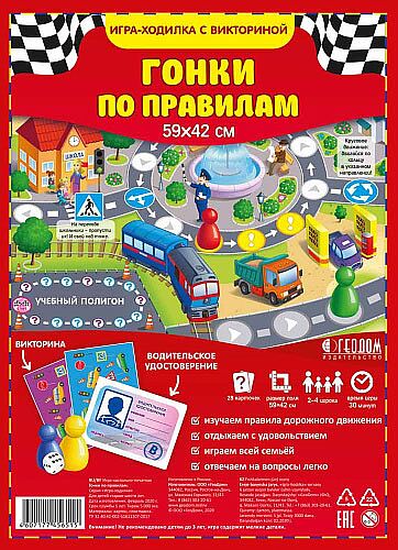 Гонки по правилам не просто настольная игра-ходилка — это настоящее приключение, в котором дети изучают правила дорожного движения. Для того, чтобы начать игру и выехать в город нужно сдать на права, а для этого игрокам предстоит ответить на несложные вопросы викторины. Только после этого участникам вручаются права и они могут выезжать в город. Игра рассчитана на детей от 6 лет, развивает внимание, тренирует память, ребенок учится считать, соблюдать правила, взаимодействовать с другими игроками, принимать победы или поражения. Игра Гонки по правилам — будет интересна не только детям, но и их папам, а это всегда источник положительных эмоций для всей семьи.