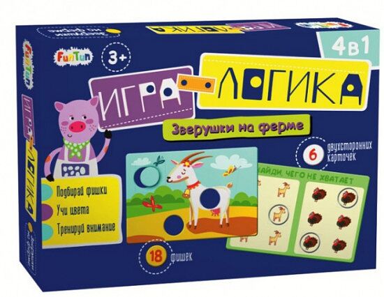 Игра-логика «Зверушки на ферме» — это наборы игр, которые предназначены для развития мелкой моторики и логического мышления у малышей. Каждый набор состоит из 6-ти двусторонних карточек и 18-ти фишек. Так, в ходе игры перед ребенком может стоять несколько вариантов задач: • подобрать фишки к изображению по цвету. • логически подобрать фишки в соответствии с рисунком. • малыши могут посоревноваться в подборе фишек на скорость. • интересный вариант — это игра вслепую на несколько игроков. Можно доставать фишки из мешочка, подходящие выкладывать себе, или же передавать ход дальше. В ходе такой увлекательной игры ребенок выучит цвета, потренирует внимание, и воспитает в себе дух соревнований.