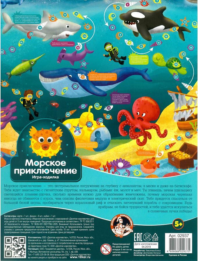 Надевай маску и акваланг и погружайся на самое дно океана! Тебе предстоит знакомство с гигантским спрутом, кальмарами и необычными рыбами. Ты узнаешь, зачем удильщику светящийся плавник-удочка, сколько времени нужно для рождения жемчужины, почему морская черепаха никогда не сбивается с курса, а также многое другое. Состав игры: - карта (59х45 см). - фишки разных цветов (высота 2 см, 6 штУК). - кубик игральный. Игра изготовлена из картона и пластика и предназначена для детей от 5 лет.