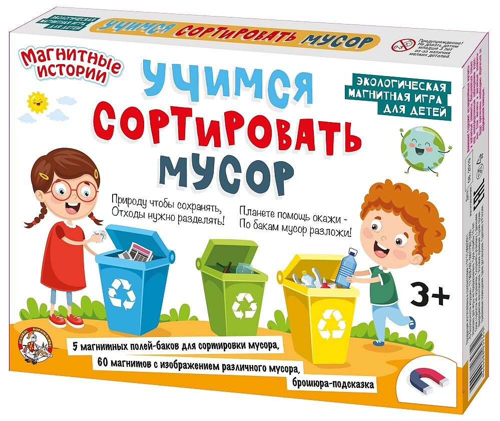 Экологическая магнитная игра для детей. 5 магнитных полей-баков для сортировки мусора. 60 магнитов с изображением различного мусора. Брошюра-подсказка.