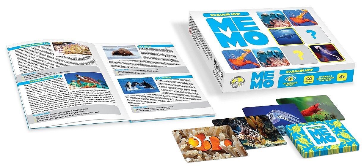 Тренируйте память, играя в классическую версию игры и открывая по 2 карточки в поисках совпавших, проверьте свою реакцию в игре Кто быстрее? или постройте Падающую башню. Соберите наибольшее число парных карт с одинаковыми изображениями и познакомьтесь с удивительными фактами о подводном мире! Состав игры: карточки (50 штук), брошюра с интересными фактами.