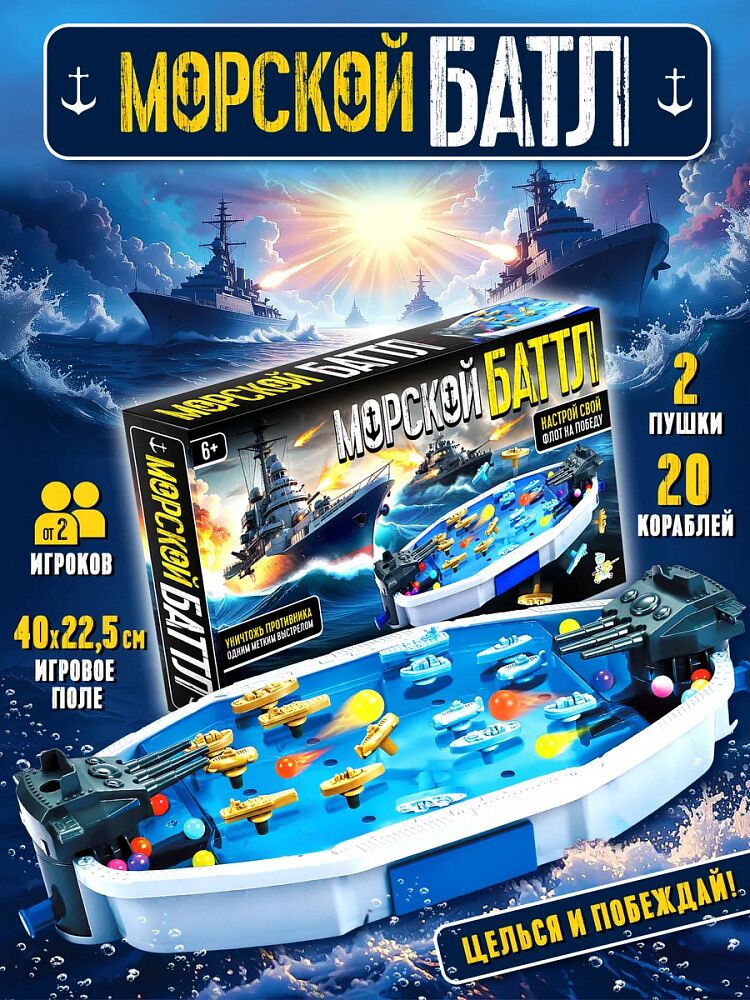 Настольная игра «Морской батл» — эта динамичная и увлекательная игра перенесет вас в эпицентр морских баталий, где ваша стратегическая мысль и меткость решат исход сражения. Представьте, как ваши корабли, гордо возвышающиеся на волнах игрового поля, готовы к решительной схватке. Комплектация: • игровое поле с пружинным блоком и отверстиями под боевые корабли (22,5×5,5×40 см) — 1 шт.. • башни с пушками (10,7×4х9 см) −2 шт.. • корабли, золотые и синие (от 3 до 4 см) — 20 шт.. • крепление для кораблей (1 см) — 20 шт.. • снаряды (шары разных цветов 1 см) — 30 шт. Рекомендовано для детей от 6 лет. Как играть? Установите дуло пушки на платформу, кораблики на поле в специальные отверстия. Поместите цветные шарики в пушки и нажмите пускатель. В игре предусмотрено два режима, чтобы каждый мог выбрать наиболее подходящий для себя. В классическом режиме игроки по очереди нажимают на пусковые устройства и обстреливают корабли противника. Здесь важна тактика и умение предугадывать действия оппонента. А если вы предпочитаете более динамичные сражения, попробуйте режим на время! В этом режиме игроки одновременно оттягивают пусковые устройства и ведут шквальный огонь в течение одной минуты. Побеждает тот, кто потопит больше вражеских кораблей. Особенностью игры является то, что стрельба шарами проходит внутри поля. Это не только добавляет реалистичности сражениям, но и гарантирует, что шары не будут разлетаться по всей комнате и всегда будут в сохранности. А для удобства извлечения шаров предусмотрен открывающийся отсек сбоку поля. Настольная игра «Морской батл» — это отличный способ провести время с семьей и друзьями, развить стратегическое мышление, меткость и просто получить массу удовольствия от захватывающих морских баталий. Настройте свой флот на победу и докажите, что вы — настоящий адмирал!