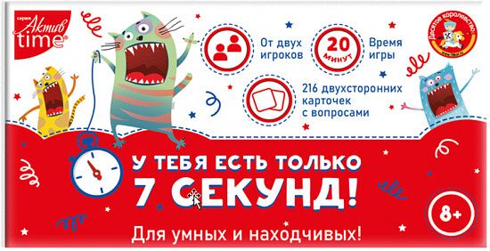 Настольная игра «У тебя есть только 7 секунд!» - это игра для большой компании, в которой вы можете проявить свою находчивость и эрудированность. Количество игроков - от 2 человек, но можно играть и командами. Состав игры: • 216 карточек с вопросами. • таймер на 7 секунд. • инструкция. Для детей старше 8 лет. Как играть: Цель игры - за время игры собрать как можно больше карточек. • Перемешайте карточки и выложите в центр стола одним цветом вверх. • Установите очередность ходов. • Каждый игрок поочередно берет карточку с вопросом, зачитывает его и ставит таймер. • Если игрок успевает ответить на вопрос за 7 секунд, он забирает карточку себе. Если ответить не удалось, ход переходит к следующему игроку, карту откладывают. Побеждает тот, кто первым набрал 15 карточек. Увлекательная настольная игра для большой компании «У тебя есть только 7 секунд!» развивает интеллект, мышление, быстроту реакции и дух соперничества.