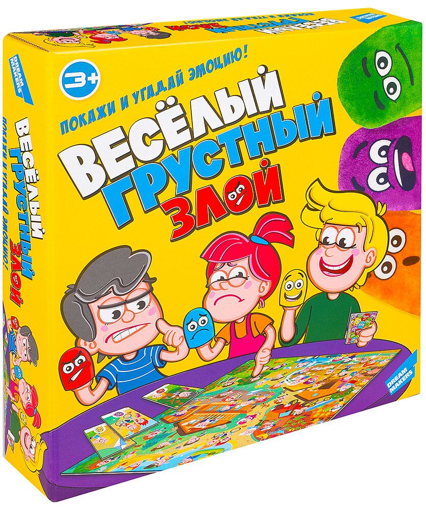 Настольная игра Dream Makers Веселый грустный злой. Особенности: подходит для малышей и дошкольников. Комплектация: игровое поле 1 шт., куклы-эмоции (двухсторонние) 3 шт., игровые карточки 50 шт., правила игры 1 шт. Возраст: 3+ Веселый грустный злой? Кого показываешь ты? Цель игры - показать эмоцию персонажа из карточки так, чтобы другие игроки смогли найти его на игровом поле. Яркие и мягкие куклы помогут вам в этом. Игра способствует развитию эмоционального интеллекта, артистизма и коммуникабельности! Откройте для себя игру эмоций!