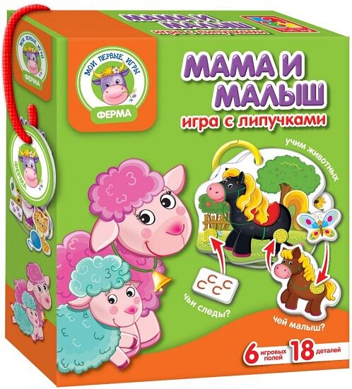 Настольная игра «Ферма» от компании Vladi Toys включает в себя несколько красочных полей и 18 отдельных деталей, которые крепятся к ним с помощью липучек. Веселые животные, изображенные на элементах увлекательной игры, которые имеют достаточно крупные размеры для маленьких ручек, сделают ее более забавной и интересной.