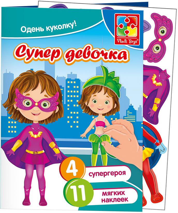 Супергерои спешат на помощь! Ребёнок познакомится с маленькой девочкой Евой, которая может превращаться в разных супергероев, и поможет ей правильно подобрать элементы костюма. Развиваем творческие способности с мягкими наклейками! Рассмотрите поле-основу, на нём изображены 4 девочки. Теперь изучите наклейки. Ребёнок должен одеть девочек, комбинируя элементы костюмов. Какие герои получились? Назовите их имена. На обратной стороне игрового поля есть описание сверхспособностей героев. Читайте его и придумывайте увлекательные приключения с участием наших персонажей. Детали на самоклеющейся основе изготовлены из мягкого объемного материала, лёгкие и приятные на ощупь. Состав набора: • игровое поле. • 11 мягких наклеек.