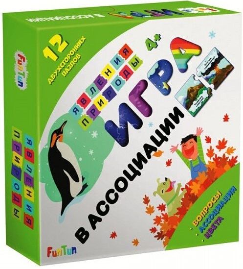 Игра в ассоциации «Явления природы» — это яркий и креативный набор игр. Каждая игра содержит 12 двусторонних половинок, которые нужно соединить в пару по ассоциации, либо же по одинаковому заднему фону. Так, на одной из половинок изображена сюжетная картинка, а на другой половинке — предмет который связан с этим сюжетом. Игра прекрасно развивает логику, мелкую моторику, внимание, память и что важно — ассоциативное мышление. Таким образом ребенок не только лучше ознакомиться с окружающим миром, но и разовьет фантазию, ведь с помощью карточек можно придумать и свой собственный интересный сюжет.