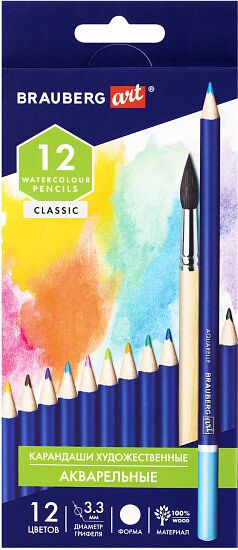 Карандаши художественные цветные акварельные BRAUBERG ART CLASSIC, 12 цветов