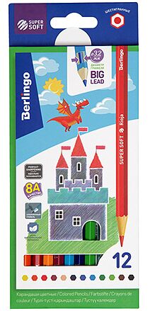 SuperSoft - линейка качественно новых цветных карандашей Berlingo. 12 цветов. Шестигранная форма. Указание цвета на каждом карандаше на английском языке. Поле для подписи имени владельца на каждом карандаше. Упаковка в плотную матовую картонную коробку со склеенным европодвесом. Грифели высочайшего стандарта качества 8А, являющегося максимальным для нехудожественных цветных карандашей. Мягкость письма, сравнимая с рисованием маслом и пастелью. Яркие насыщенные цвета, обладающие превосходной смешиваемостью. Увеличенная до 3,2 мм толщина грифеля для безупречно комфортного раскрашивания. Уникальная формула и технология производства грифелей, в результате которой достигается одновременно удивительная мягкость письма и прочность, позволяющая грифелю выдерживать даже сильное нажатие под углом 45 градусов. Специальная проклейка, предотвращающая поломку грифеля внутри карандаша при падении. Стойкость к повреждениям. Корпус из древесины высшего качества, прошедшей тщательную обработку. Материал, сохраняющий свою прочность и легко поддающийся ровной заточке без усилий. Уникальная антибактериальная обработка на специализированном оборудовании, гарантирующая безопасное использование продукции детьми.