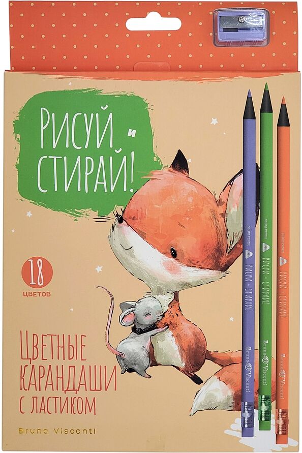 Всем хорош набор карандашей «РИСУЙ и СТИРАЙ» от Bruno Visconti: карандаши ярко рисуют и легко затачиваются точилкой, которая идет в комплекте. Ластик на кончике карандаша отлично стирает цветовые пигменты. Без сомнения, карандаши «РИСУЙ и СТИРАЙ» порадуют юного художника. Их эргономичная трехгранная форма способствует снижению усталости кисти и обеспечивает максимальный комфорт при использовании. Грифель диаметром 2,8 мм содержит высококачественные цветные пигменты и выдерживает сильный нажим. Яркий рисунок и мягкое скольжение карандаша по поверхности бумаги гарантированы. Грифель надежно защищен корпусом из ударостойкого пластика, он не сломается при падении карандаша и легко затачивается при необходимости. Устраняем ошибки и неточности в рисунке, создаем отличные условия для воплощения творческих идей в жизнь!