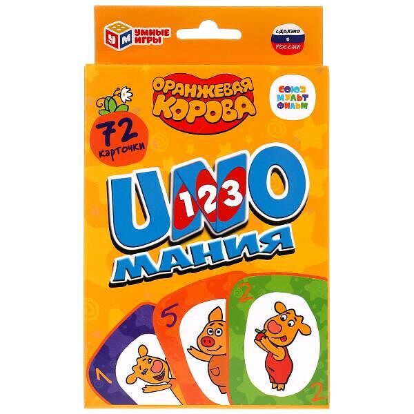 Развивающие карточки «Оранжевая корова. Уномания» ТМ «Умные игры» - отличный вариант для увлекательного и познавательного времяпровождения вместе с ребёнком: - 70 красочных игровых карточек + 2 карточки с правилами в комплекте - изучаем цифры и цвета - любимые персонажи - понятные правила