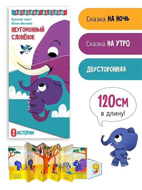 Каждое утро наш неугомонный слоненок просыпается от загадочных звуков и отправляется на поиски их источника. А когда наступает вечер, он не может уснуть, ведь у него еще столько дел! Знакомая ситуация, не так ли? Эта увлекательная книга станет настоящим другом для детей до года и от года, погружая их в захватывающие истории о приключениях слоненка, которые разворачиваются прямо перед ними. Яркая картинка в книжке раскладывается до 120 см, превращая чтение в настоящее приключение!