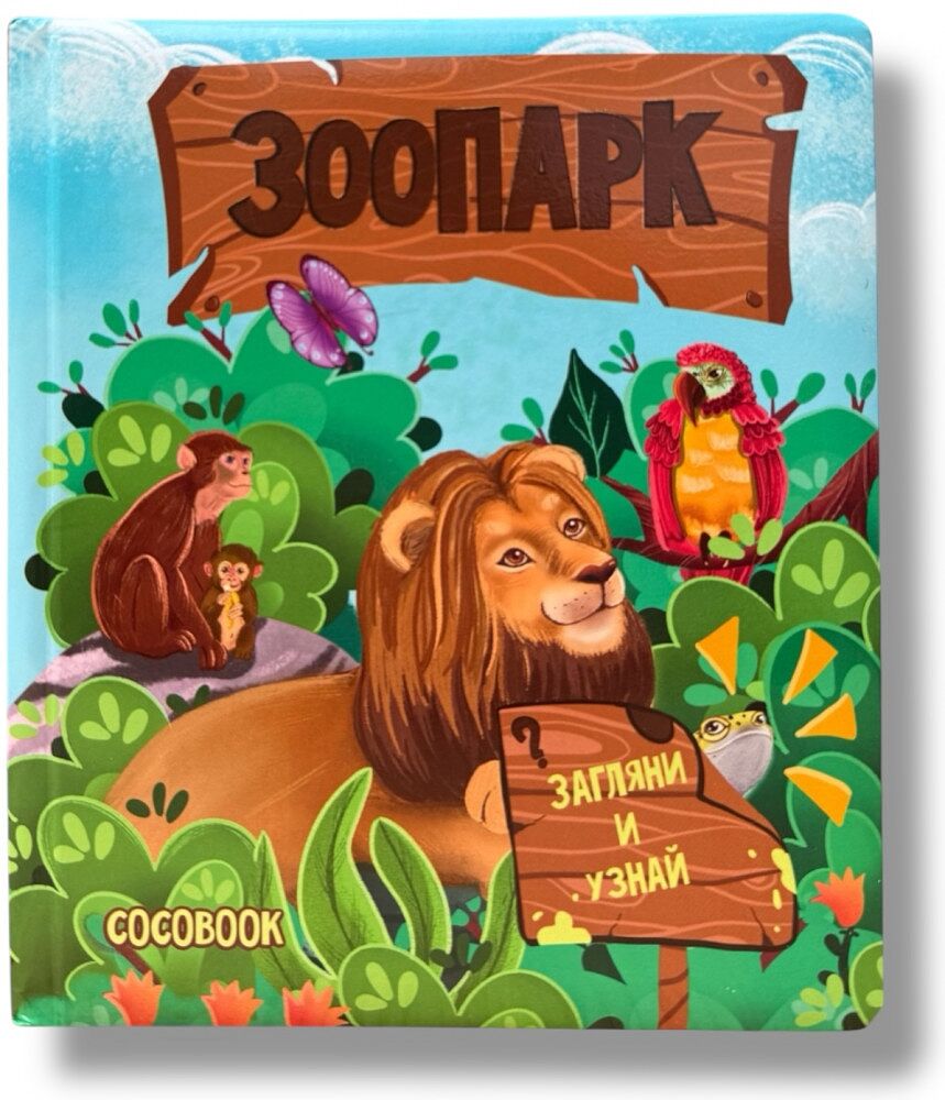 Зоопарк — интерактивная книга с окошками! Открывайте окошки и находите спрятавшихся животных! Кто прячется за листвой? А кто затаился в воде? Лев рычит, хамелеон меняет цвет, а бегемот широко разевает пасть! Открывайте страницы, заглядывайте в листву, траву, воду и деревья, ищите спрятавшихся животных и узнавайте их секреты! Энциклопедические вставки делают книгу не только увлекательной, но и познавательной — дети узнают, почему львы спят 20 часов в сутки, как хамелеон ловит добычу, зачем слону хобот и многое другое! Яркие, детализированные иллюстрации — создают эффект присутствия и делают чтение еще интереснее. У книги безопасный и удобный формат, прочные странички и удобный размер для детских ручек.