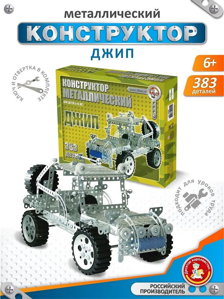 Детский металлический конструктор для мальчиков «Джип» состоит из 383 деталей и предназначен для «продвинутых конструкторов» от 7 лет и старше. Кроме металлических деталей в набор входят пластиковые и пластмассовые детали. Как и во всей серии конструкторов «Как раньше», конструкция достаточно сложная, поэтому машина получится не сразу, и, возможно, вам придется даже вмешаться в процесс и пом