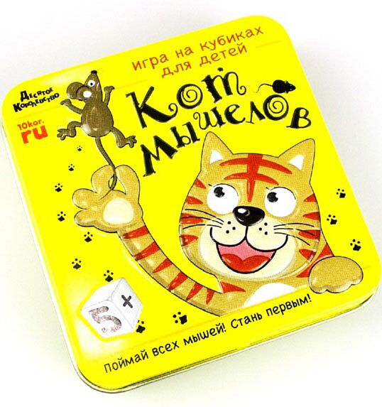 Настольная игра Кот-мышелов позволит ребенку почувствовать себя котом, которому для первенства нужно поймать побольше мышей. Состав: - пластиковые кубики - 16 шт. (18 х 18 мм) - мешочек из ткани - инструкция Игра хранится в компактной жестяной коробочке (9 х 9 см). Поохотиться за мышами могут от 2 до 4 игроков. Как играть? Перед началом игры запаситесь бумагой и ручкой, чтобы вести учёт пойманным мышам. Ход определяется по жеребьёвке или по возрастному различию - первым начинает самый маленький и далее по возрастанию. Кубики обозначены тремя цветами: красным, зелёным, жёлтым. Первый игрок берет 13 кубиков и закидывает их в мешочек, закрывает его и хорошенько трясёт. Далее (не подглядывая) достает 3 кубика и бросает их на стол. Каждый кубик - это или еда, или злой пёс, или мышиная нора. Если выпало изображение с мышью, то это пойманная добыча, кубик (или кубики) игрок кладёт справа от себя. Выпало изображение со злым псом - нужно бежать от него, кубик (или кубики) игрок кладёт слева от себя. Выпало изображение с мышиной норой - мышь успела убежать от тебя, кубик (или кубики) игрок выкладывает перед собой. Только эти кубики разрешается перебросить повторно, добавив к ним новые из мешка. Если кубики, которые можно повторно бросать, закончились, то на бумагу записывается пойманное число мышей и ход переходит к следующему игроку. Если на всех трёх кубиках выпало изображение злого пса, тогда на бумагу записывается пойманное число мышей и ход переходит к следующему игроку. Цель - первым собрать 13 очков (1 кубик с мышью = 1 очко). Содержит мелкие детали, не предназначено для детей до 3-х лет. Сделано в России.