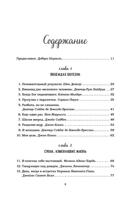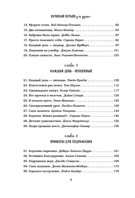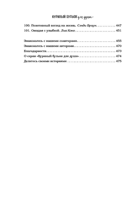 В детстве, когда вы болели, ваша бабушка давала вам куриный бульон. Сегодня питание и забота нужны вашей душе. Маленькие истории из «Куриного бульона» исцелят душевные раны и укрепят дух, дадут вашим мечтам новые крылья и откроют секрет самого большого счастья — счастья делиться и любить. На что потратить последние деньги, когда лишился работы? Конечно, на стартап! Бренда потеряла в автокатастрофе семью, но нашла в себе силы начать все снова. Шон решил быть счастливым, несмотря на ВИЧ-статус. Лишившись работы, Мэтт и подумать не мог, что это станет для него большой удачей. Оказывается, чтобы провести лучший отпуск в жизни, Шейле с мужем нужно было потерять паспорт и все деньги. Трудно грустить, катаясь на велосипеде. И другие 95 поразительных историй, от которых вы не сможете оторваться.