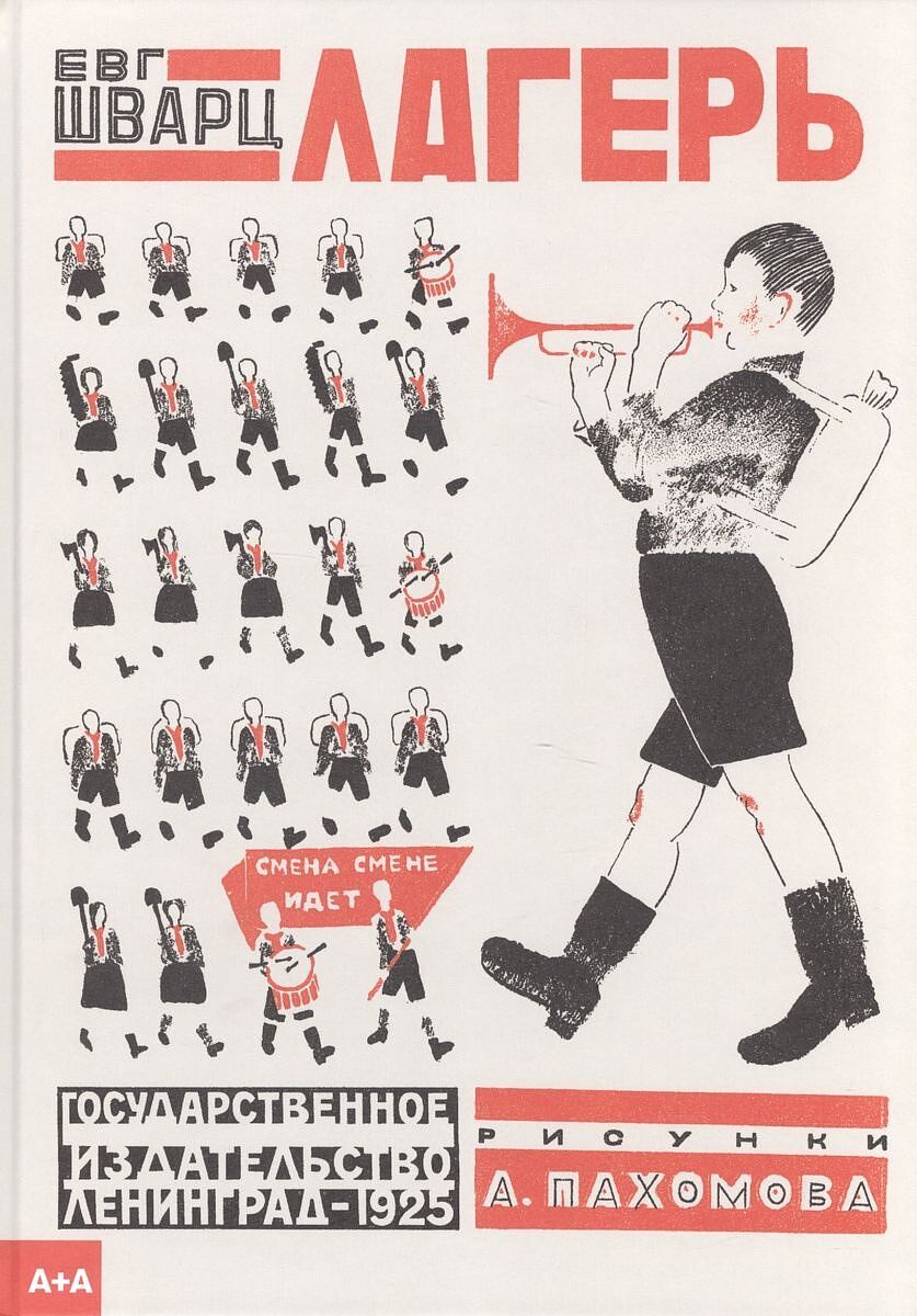 Книга Шварца и Пахомова была первой не только в биографиях писателя и художника, она также оказалась прорывом в книжном дизайне, образцом для последующих детгизовских опытов. Вся книжка «Лагерь» построена на двух цветах, и при этом ее полосы напоминают репродукции с живописи. Причина — литографская печать, оттиски делались с камней, они роскошно передают фактуру материала, живость зерна литографского камня. Красно-черные заливки хорошо гармонируют с проработкой а-ля сухая кисть.