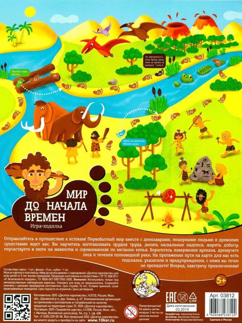 Отправляйтесь в путешествие по древней Земле! Познакомьтесь с динозаврами, пещерными людьми и древними животными, научитесь делать орудия труда, узнайте скрытый смысл наскальных надписей и поучаствуйте в охоте на мамонтов! Состав игры: • карта (59х45 см) – 1 шт. • фишки разных цветов (высота – 2 см) – 6 шт. • кубик игральный – 1 шт. Игра изготовлена из картона и пластика и предназначена для детей от 5 лет.