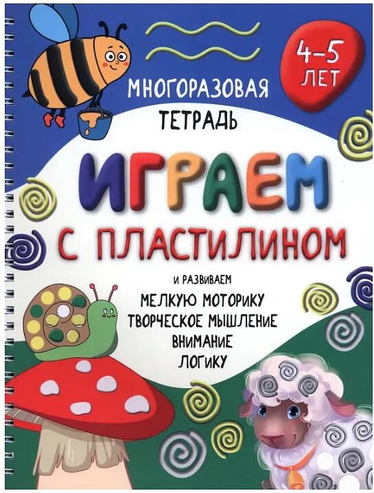 Многоразовая тетрадь Играем с пластилином для детей 4-5 лет. Обучение в игровой форме, интересные задания, все это делает рабочую тетрадь уникальной и любимой развивашкой ребенка. Каждая страница заламинирована, на ней можно лепить сколько угодно раз. 30 увлекательных разных заданий для ребенка.