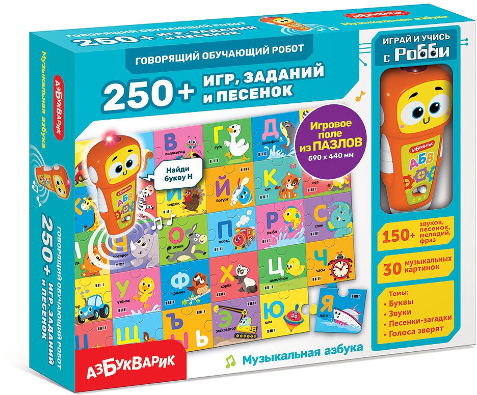 В игровом наборе «Музыкальная азбука» ребенок найдет говорящего робота со сканером штрихкодов и пазл из 30 элементов. Перед началом игры ребенку нужно самостоятельно собрать большое игровое поле-пазл. Затем можно учить буквы, играть и петь песенки вместе с роботом Робби. Для этого нужно просто ставить робота на штрихкоды возле букв и картинок — он будет говорить и петь. Робби споет короткую песенку про каждую букву, ребенок сможет подпевать — так он гораздо лучше запомнит алфавит. Это новый подход к обучению! Робот считывает штрихкоды с помощью специального сканера. Чтобы он работал правильно, нужно ставить робота точно на изображение штрихкода, держа игрушку вертикально. Как играть с Робби — будет интуитивно понятно даже малышу! Робот сам подскажет, что нужно делать, а также подбодрит ребенка веселыми словами и фразами. Во время игры у робота мигает лампочка. У робота 6 режимов работы («Музыкальная азбука», «Слова и звуки», «Музыкальный плеер», «Прятки с буквами», «Угадай звук», «Песенки-загадки»). Переключать их можно с помощью тумблера — каждый раз будет включаться новый режим. Набор рассчитан на несколько часов веселых занятий — в нем 30 говорящих картинок, более 250 игр, заданий и песенок.