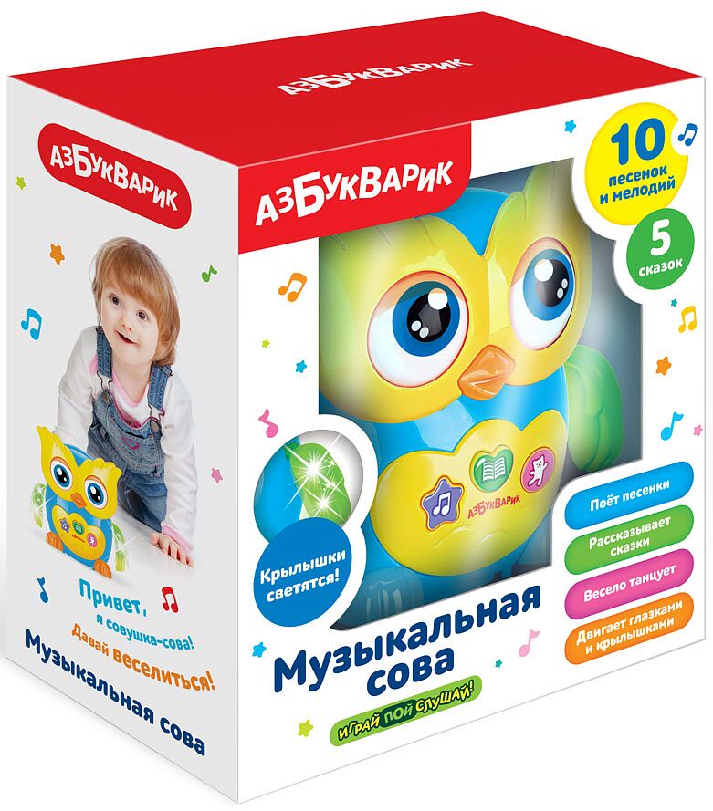 Оживите вместе с ребёнком музыкальную сову своим прикосновением, и она начнёт петь и махать крылышками в такт! А ещё игрушечная сова умеет разговаривать: она расскажет вашему ребёнку первые детские сказки: Курочка Ряба, Колобок, Репка, Теремок, Заюшкина избушка и расширит словарный запас ребёнка. Музыкальная сова рекомендована детям от 3 лет. Особенности: двигаются глаза и крылышки совы. На крылышках есть мигающие огоньки, которые двигаются в такт песенкам и мелодиям: Два весёлых гуся, Добрый жук, Песенка про алфавит, Четыре таракана и сверчок, Если весело живётся, делай так, Полька, Арам зам-зам, 33 коровы, Собачий вальс, Немецкая полька. Эта музыкальная игрушка способствует речевому развитию ребенка, формирует коммуникативные качества и музыкальные способности, а также знакомит с русским народным творчеством. Бонус - QR-код для скачивания интерактивной книжки Караоке в мобильном приложении Азбукварик.
