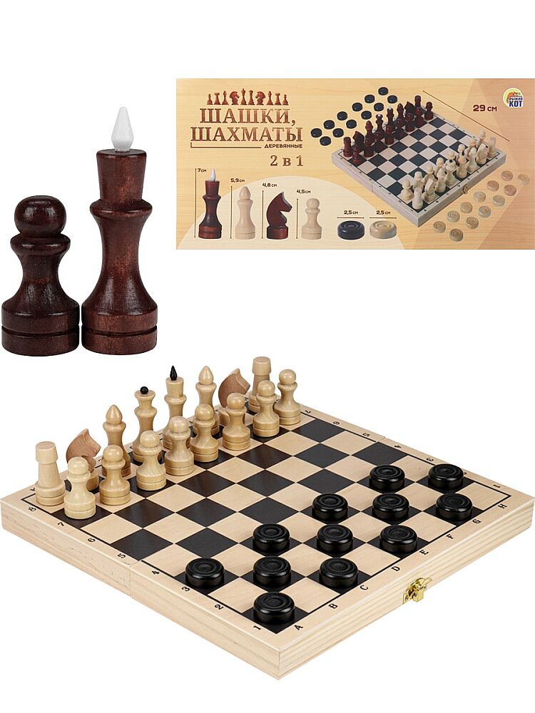 Популярные настольные игры (классические шахматы и шашки) в одном наборе отличная идея подарка для себя и своих близких. Разнообразие игр позволит не просто скрасить досуг, а провести время с большой пользой! Они способствуют развитию интеллекта, памяти и внимания, а также приучают мыслить логически. Особенности: король высота 72мм, диаметр 21мм. пешка высота 46мм, диаметр 21мм. шашки высота 9мм, диаметр 26мм.
