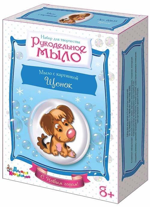 «Щенок» серии наборов «Рукодельное мыло» - самый праздничный набор с картинкой для изготовления мыла своими руками! С его помощью ребенок 8-ми лет и старше сможет сделать приятный подарок своим близким на Новый год. Для этого потребуется внимание, ответственность и строгое соблюдение инструкции. Единственным ограничением является контроль и помощь со стороны взрослых при нагреве и манипуляциях с горячей мыльной основой.