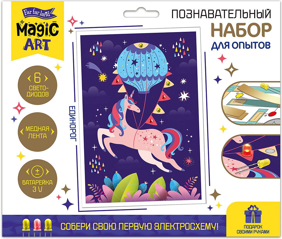 Набор для опытов «Единорог» — набор для создания открытки со светящимися элементами. С его помощью можно создать необычный памятный подарок для друзей и родных. Набор для опытов предназначен для детей старше 14 лет. На обратной стороне коробки дана подробная инструкция по сборке электросхемы. Комплектация набора: • картонная открытка — 1 шт.. • светодиоды — 6 шт.. • токопроводящая медная самоклеящаяся лента — 1 м. • питающий элемент 3V (батарейка CR2032) — 1шт. Порядок действий: 1. Удалите защитный бумажный слой с медной ленты-проводника. 2. Наклейте ленту на рисунок бежевого цвета. 3. Наклейте ленту на рисунок зелёного цвета. 4. Соедините части ленты между собой для наилучшего контакта согласно иллюстрации из инструкции. 5. Закрепите светодиоды согласно инструкции. 6. Установите батарейку согласно инструкции. Готово! Смотрите, как ваше творение оживает и светится в руках!