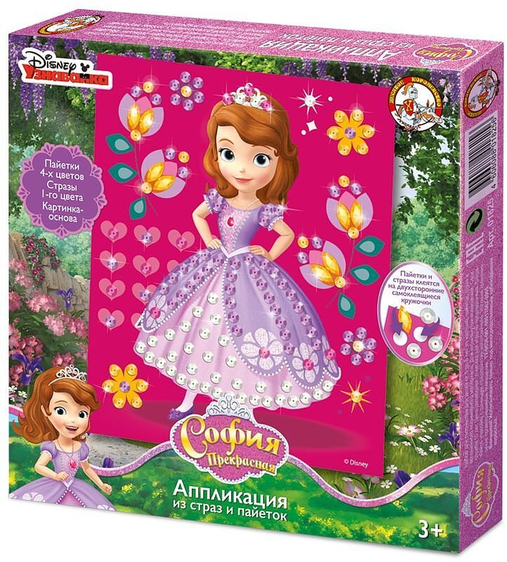 София Прекрасная - еще одна героиня одноименного мультсериала компании Уолт Дисней, которую очень любят девочки дошкольного возраста. Задача ребенка украсить Софию Прекрасную пайетками и стразами в местах, обозначенных соответствующим цветом и формой. Набор содержит все необходимые для творчества элементы - паетки 4-х цветов (красный, фиолетовый, золотистый, серебристый), стразы золотистого цвета, картонная основа (205 х 170 мм) с изображением Софии Прекрасной и самоклеящиеся кружочки из вспененного полимерного материала (200 шт). Набор для творчества Аппликация из страз и пайеток София Прекрасная поможет в непринужденной игровой форме развить у ребенка в возрасте от 3-х лет мелкую моторику, творческие способности, внимание и усидчивость. Однако, из-за наличия мелких деталей, рекомендуется украшать аппликацию под присмотром взрослых.