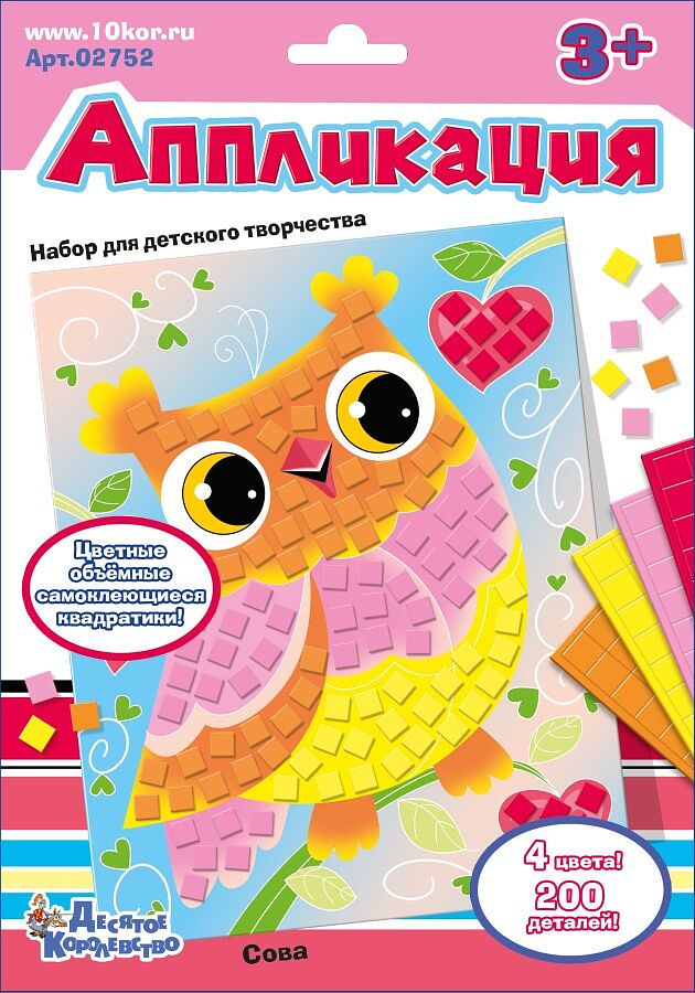 Аппликация «Сова» — набор для творчества для детей от 3-х лет. Украшайте картинку самоклеящимися квадратиками, развивайте моторику пальчиков и стимулируйте творческие способности ребёнка. Подберите квадратик по цвету. Отделите самоклеящейся квадратик от блока. Приклейте квадратик на картонную основу, на соответствующее его цвету место. Внимание! Контроль взрослого во время работы с аппликацией обязателен — набор содержит мелкие детали. Комплектация: • картонная основа с цветным рисунком (20 × 16 см). • самоклеящиеся квадратики (7 × 7 × 2 мм), 4 цвета — 200 шт.