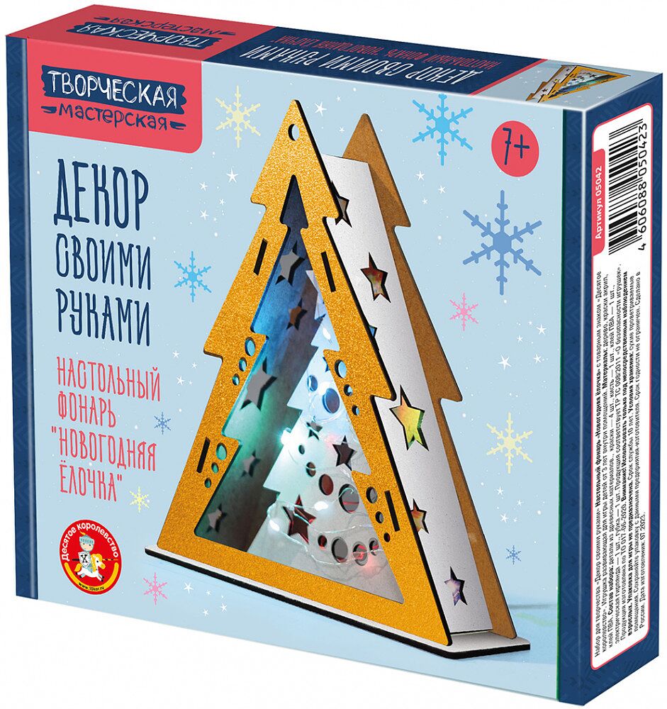 С набором для Декора своими руками «Настольный фонарь. Новогодняя ёлочка» вы создадите неповторимую атмосферу праздника и уюта в доме. Создание декора своими руками развивает моторику, творческие способности и эстетический вкус. Декор «Настольный фонарь. Новогодняя ёлочка!» украсит интерьер или станет приятным праздничным подарком для друзей и близких. Высота готового фонаря 19 см. Размеры основания — 7×17,5 см. Комплектация набора: • детали из древесного материала — 6 шт.. • краски акриловые на водной основе — 4 шт.. • кисточка — 1 шт.. • клей ПВА — 1 шт.. • электрическая гирлянда — 1 шт.. • губка — 1 шт.