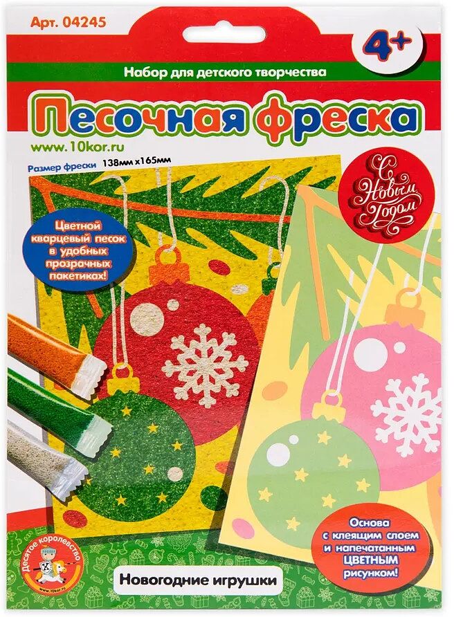 Создайте красочную песочную фреску с набором «Новогодние игрушки». Работа с песочной фреской помогает развивать творческие способности ребёнка, а также тренирует мелкую моторику рук, учит малыша аккуратности и вниманию. В наборе: • картинка-основа с клеящим слоем и напечатанным цветным рисунком (13,8 × 16,5 см). • кварцевый песок в прозрачных пакетиках — 6 шт. (пяти цветов — белый, оранжевый, жёлтый, красный, зелёный). Как работать с песочной фреской? • положите основу с рисунком перед собой. Используя картинку на упаковке как подсказку, выберите, песком какого цвета вы засыпете ту или иную часть фрески. • снимите верхний, защитный слой бумаги с участков, которые будут одного цвета. • засыпьте открытые участки песком выбранного цвета (от тёмного к светлому), старайтесь, чтобы песчинки ложились равномерно и плотно.