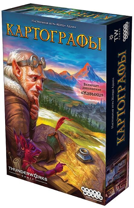 Картографы – семейная настольная игра, в которой можно отправиться навстречу приключениям хоть в одиночку, хоть огромной компанией! Целый год (условный, конечно же) игрокам предстоит путешествовать по королевским землям, старательно зарисовывать изученные окрестности в картографические планшеты, получать за свои старания золотые монеты из казны, а также почётные звёзды, в коллекционировании которых и заключается главная задача. Как играть? Перед началом игры каждый участник получает в своё распоряжение главный атрибут картографа – планшет, а также карандаш, чтобы красиво оформить сей документ своим именем, титулом, а также, по желанию, фамильным гербом. Игровые карты раскладываются в центр стола разными стопками и колодами, в соответствии с приложенными правилами. Получив добрые пожелания от родных и близких, наши герои выдвигаются в путь. Игровой год, как и год всамделишный, состоит из четырёх сезонов – времён года, и начинается он с весны. В каждом сезоне игроков ждут несколько раундов, а те, в свою очередь, делятся на три фазы. В первой фазе исследования открывается верхняя карта одноимённой колоды, после чего во второй фазе картографии игроки должны изобразить на своём планшете выбранную фигуру, указанную на открытой карте исследования, соблюдая при этом определённые правила и ограничения. За некоторые фигуры игроки получают золотые монеты, некоторые же фигуры нарисовать не получится, если не соблюдены все указания. В этом случае на карте владений рисуется одна клетка, которая заполняется каким-либо типом местности, кроме гор. В колоде исследования может попасться карта аномалии. В этом случае все рисуют у себя одну лишь клетку с типом местности. Если открывается карта руин, то за ней сразу же открывается следующая карта, а игроки впоследствии должны будут нарисовать ту или иную фигуру, перекрывая у себя на планшете одну из клеток руин. И, наконец, при открытии карты засады игроки меняются планшетами и изображают на чужих владениях фигуры с монстрами. В третьей фазе, после подсчёта показателей времени на открытых картах исследования, завершается или продолжается текущий сезон. В конце каждого сезона игроки подсчитывают победные очки за выполненные королевские указы. Перед началом следующего сезона открытые карты исследований перемешиваются и возвращаются в колоду, и при этом к ним добавляется ещё одна карта засады, независимо от того, выпала она в прошедшем сезоне или нет. Кто победил? После окончания последнего, зимнего сезона, игра объявляется завершённой, а набранные игроками звёздочки, а точнее, победные очки, суммируются. Кто сумел обойти всех и набрать наибольшее количество очков, объявляется победителем и лучшим картографом года по мнению всего королевства. Также вы вправе отправиться исследовать королевство в одиночку, и тогда в конце похода вас ждёт признание ваших заслуг самой королевой. Вы можете прослыть как криворуким чертёжником, так и искусным мастером, так что придётся постараться! В режиме одиночной игры следует играть по привычным правилам, но с учётом небольших уточнений. Также в коробке с игрой вы найдёте дополнение Навыки, которое привносит разнообразие в процесс, добавляя восемь карт навыков. Их можно использовать, только потратив заработанные честным исследовательским трудом золоты