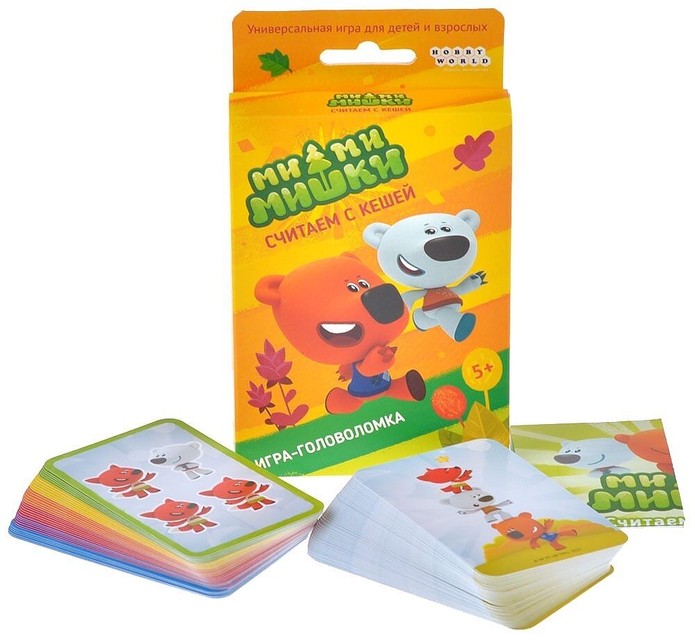 Неутомимый выдумщик Кеша придумал очередную игру, в которой он собирается проверить счёт и внимательность своих друзей. Заручившись помощью Цыпы, Кеша аккуратно склеил фотографии себя и своих друзей и приготовил с ними интересные задачки. Помогите Тучке и Лисичке выполнить их! Об игре Ми-ми-мишки: Считаем с Кешей – это универсальная игра для детей и их родителей с простыми правилами, в которых разберутся даже самые маленькие игроки. Узнаваемые герои мультфильма привлекут к себе внимание, а образовательный игровой процесс поможет направлен на развитие у детей внимательности и навыка счёта. Весёлое и азартное времяпрепровождение будет обеспечено всем без исключения! Как играть? В игре есть 2 типа карт: карты заданий и карты друзей. Сначала разделите их и положите карты заданий в центр стола лицевой стороной вниз. Карты друзей разделите на 6 наборов по цветам и раздайте каждому игроку по одному набору. Карты в наборах одинаковые, они отличаются только цветом рамки. На картах друзей изображены 4 героя мультфильма – Кеша, Тучка и Лисичка, – каждый из которых повторяется разное количество раз. На картах заданий изображены всё те же герои, но с цифрами. Игрок выкладывают карты друзей перед собой в открытую. Затем открывается первая карта задания. Цель каждого игрока – заполучить эту карту. А чтобы это сделать игрок должен найти среди своих карт такие, на которых изображены Кеша, Тучка и Лисичка суммарно столько раз, сколько на карте задания. Как только нужные карты были найдены, игроку нужно выдвинуть их вперёд, а карту задания накрыть ладонью. После этого игроки проверяют, правильно ли было выполнено задание. Если нет, то раунд продолжается. Если да – игрок забирает эту карту задания себе. После чего открывается следующая карта и начинается новый раунд. Кто победил? Могут быть ситуации, что несколько игроков выполнили задание одновременно, в этом случае карту забирает тот, кто первым выложил правильный набор карт и накрыл ладонью карту задания. Игра заканчивается, когда один из участников набирает 8 карт заданий – он и объявляется победителем!