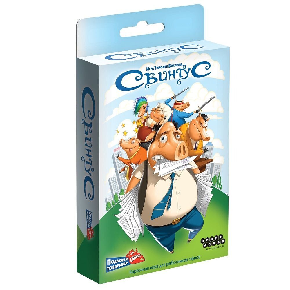 Итак, сражение за звание лучшего работника можно объявлять открытым! Не бойтесь, Вам не придётся носиться за коллегой со степлером или убегать от начальника, подозрительно занёсшего монитор над вашей головой. Теперь все проблемы можно решить интеллигентно! Вы спросите нас, как? Мы ответим: Свинтус. Да нет же, это мы не про вас! Ой, да просто прочитайте то, что мы ниже написали... Об игре Настольная игра Свинтус – это весёлая и быстрая карточная игра для любой компании от 2 до 10 человек. Игра подойдёт детям, но в неё интересно играть и взрослым. В неё можно играть дома, в кафе или в дороге – Свинтус прекрасно скрасит ваш досуг. Простые правила, яркий и милый дизайн, динамичный игровой процесс – эти особенности превратили Свинтуса в настоящий хит! Хотя сама игра и полностью карточная, тем не менее в ней вам пригодятся даже такие навыки, как хорошая реакция, рефлексы, внимательность и память. Ну и, конечно, компания товарищей, готовых как следует поразвлечься! Как играть? Да очень и очень просто – подложите свинью избавьтесь от всех карт с руки. Согласитесь, что это звучит гораздо проще, чем избавиться от всех плановых и внеплановых рабочих задач и груза корпоративной ответственности? Чтобы избавиться от своих 8 карт, необходимо выкладывать либо номинал на номинал (например, любую семёрку на другую семёрку), либо цвет на цвет (например, зелёный на зелёный). Конечно, есть и исключения, а также специальные карты. Что за карты? Как хорошо, что вы спросили! Рассказываем: Тихохрюн. Данная карта – лучший подарок для тех, кто устал от постоянного офисного гула. Если кто-либо из игроков выкладывает эту карту, то до тех пор, пока он не выложит снова карту в свой следующий ход, все игроки должны сохранять полное молчание, а любой нарушитель правила снимает данный запрет раньше положенного, но при этом тянет две карты Хлопкопыт – когда кто-либо выкладывает эту карту, все игроки должны тут же положить ладонь на колоду. Тот игрок, чья рука оказывается верхней (последней), берёт из колоды 2 карты. Тормозом беднягу можно и не обзывать. Ему и так несладко Перехрюк застанет всех врасплох, ведь как только эта карта будет выложена на стол, игра пойдёт в обратном направлении! Нет, теперь вам не придётся, наоборот, набирать карты на руку, просто ход будет передаваться против часовой стрелки Захрапин. Стали жертвой этой карты? Пропустите свой ход Полисвин – это карта-хамелеон, которую можно выложить абсолютно на любую карту. Только не забудьте назвать цвет карты, которую должен будет разыграть следующий игрок.