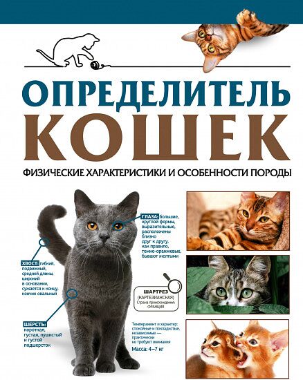 В данном издании представлено свыше 60 наиболее распространенных пород домашних кошек. Чем они отличаются, кроме очевидных признаков — параметров тела, длины и цвета шерсти, — описано и показано на иллюстрациях в этой книге. Помимо подробных физических характеристик для каждой породы приводится справочная информация об истории ее выведения, темпераменте и характере кошки, а также о продолжительности ее жизни. Имея под рукой эту книгу, каждый, рассмотрев подробнейшие рисунки, наглядные схемы и зрелищные фотографии и прочитав краткое описание, без труда выберет для себя питомца подходящей породы. А если таковой уже имеется, сможет быстро, сравнив его экстерьер и повадки с описательным и визуальным рядом в книге, определить, какой же он породы. Эта информация будет весьма полезна владельцу кошки, так как питомцу в зависимости от породы требуются определенные условия содержания, соблюдение которых станет залогом благополучной жизни домашнего любимца.